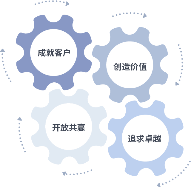 成就客户是一切决策的出发点,,,,创造价值是衡量所有工作的标准,,,,追求卓越是我们做事做人的态度,,,开放共赢是我们的格局也是最终的结果。。。。价值观的齿轮环环相扣,,,,推动着组织里的每个人不断向前。。。